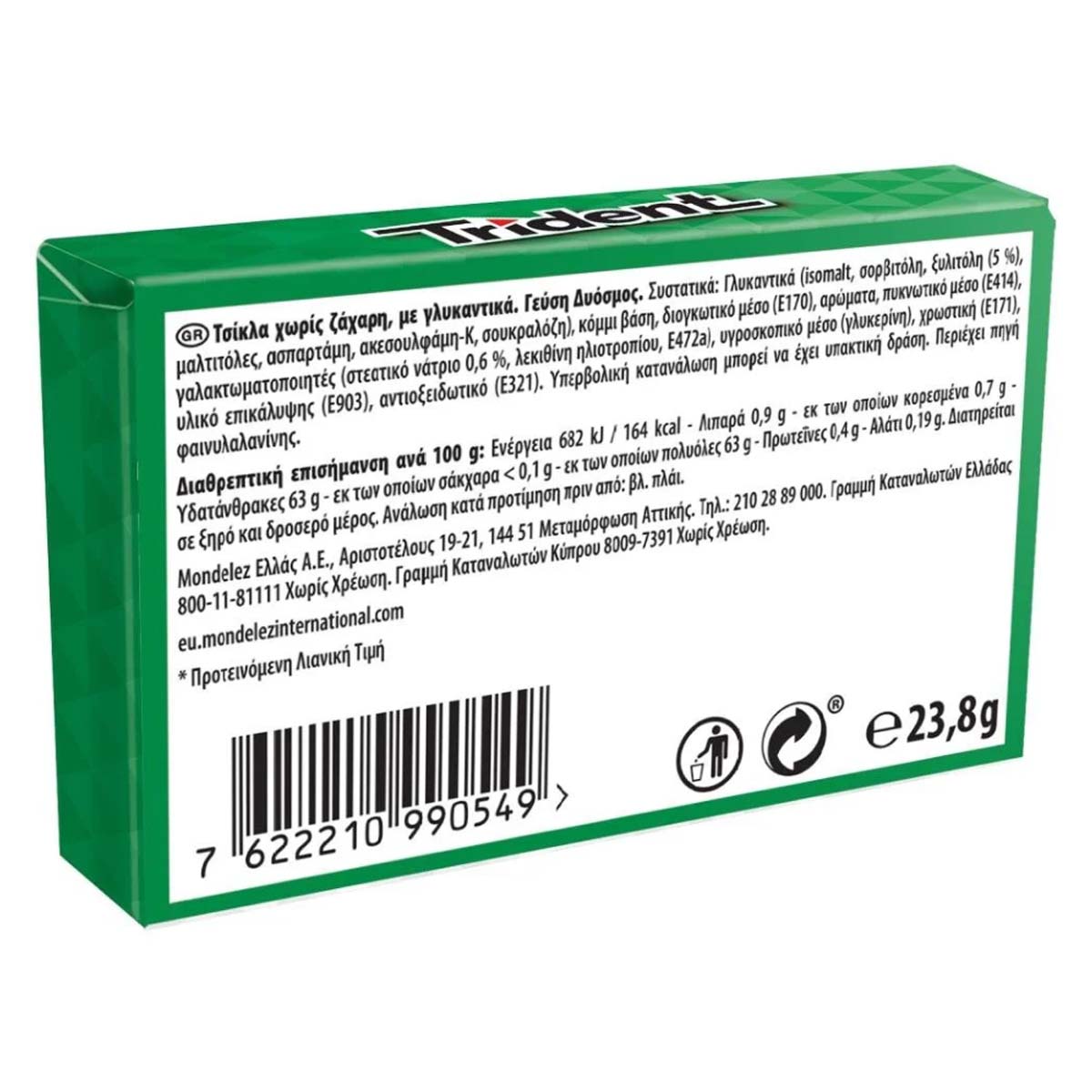 Γλυκαντικά (σορβιτόλη, μαλτιτόλη, μαννιτόλη, σιρόπι μαλτιτόλης, ξυλιτόλη, ασπαρτάμη, ακεσουλφάμη-Κ, σουκραλόζη), κόμμι βάση, διογκωτικό μέσο (ανθρακικό ασβέστιο), αρώματα, πυκνωτικό μέσο (Ε414), γαλακτωματοποιητές (άλατα λιπαρών οξέων με νάτριο, λεκιθίνη ηλιοτροπίου), υγροσκοπικό μέσο (γλυκερίνη), χρωστικές (διοξείδιο του τιτανίου, Ε141), υλικό επικάλυψης (καρναουβικός κηρός), αντιοξειδωτικό (Ε321). Περιέχει πηγή Φαινυλαλανίνης.