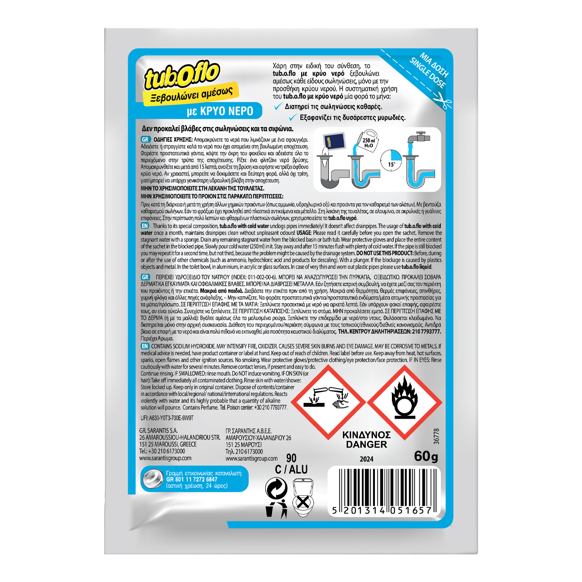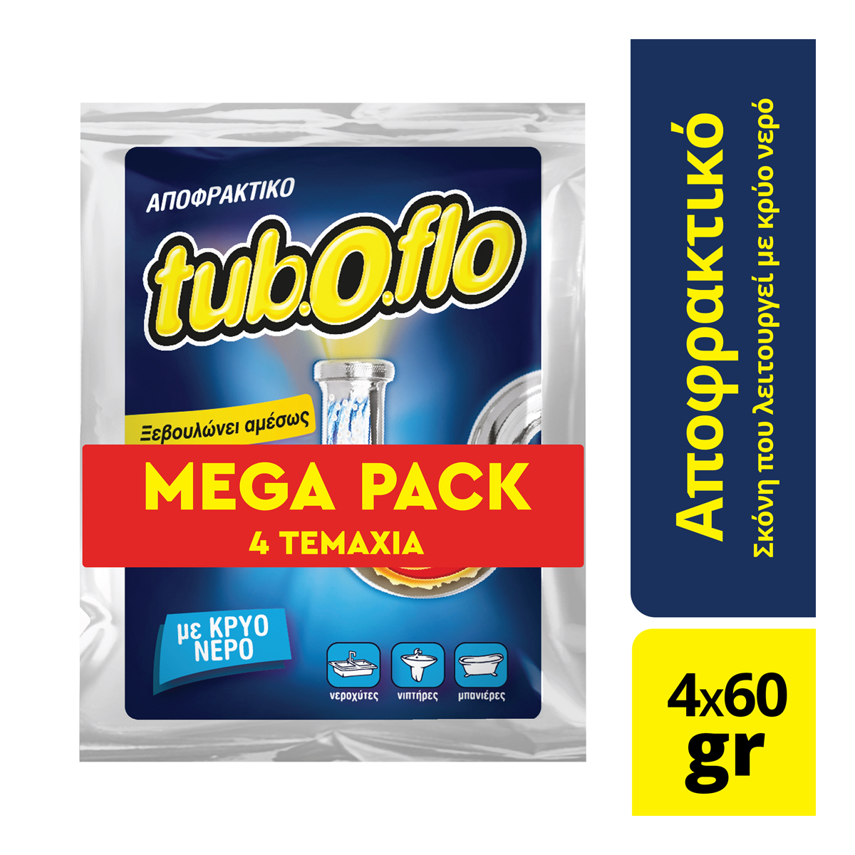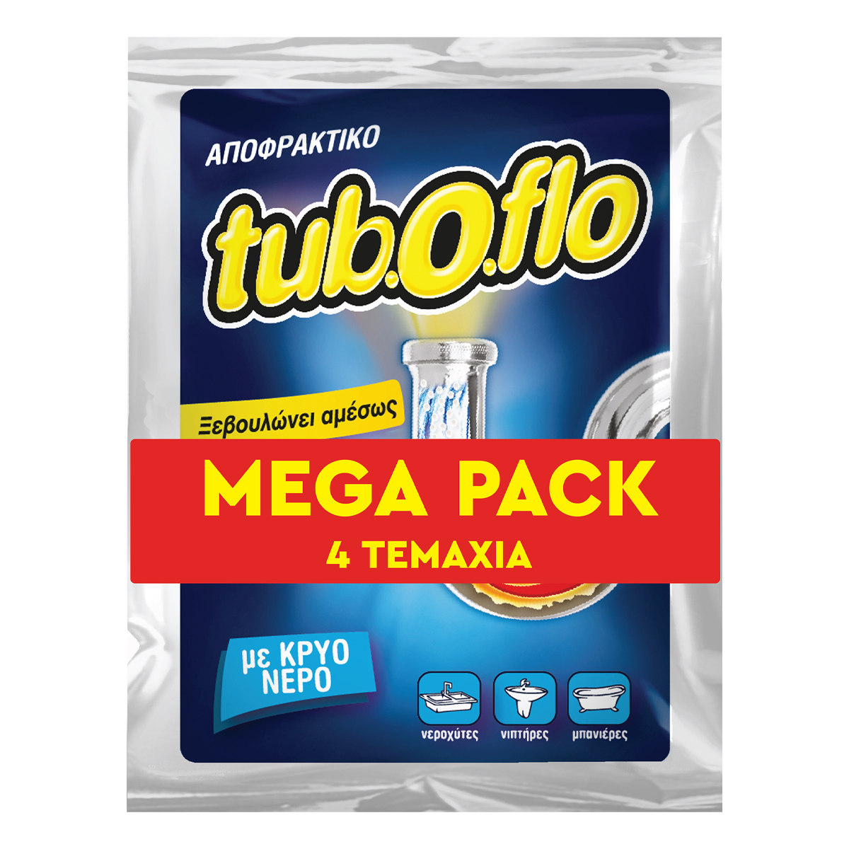 Χάρη στην ειδική του σύνθεση το Tub.o.flo με κρύο νερό ξεβουλώνει αμέσως κάθε είδους σωληνώσεις, μόνο με την προσθήκη κρύου νερού. Η συστηματική χρήση του Tub.o.flo με κρύο νερό μια φορά το μήνα: 1)Διατηρεί της σωληνώσεις καθαρές. 2) Εξαφανίζει τις δυσάρεστες μυρωδιές. 3)Δεν προκαλεί βλάβες στις σωληνώσεις και τα σιφώνια.