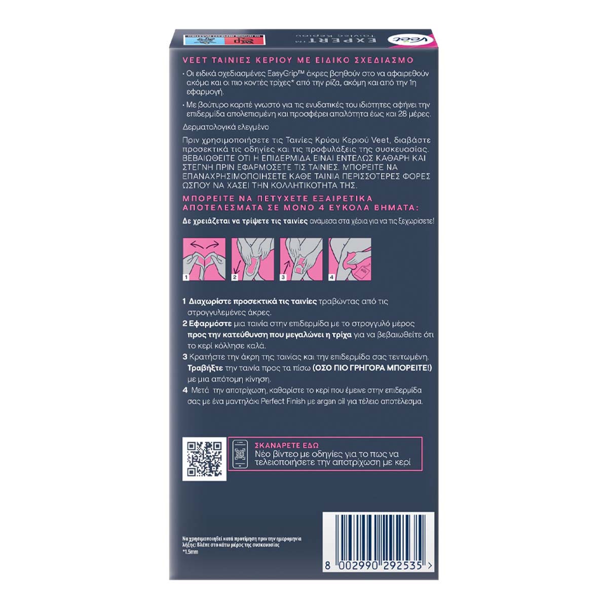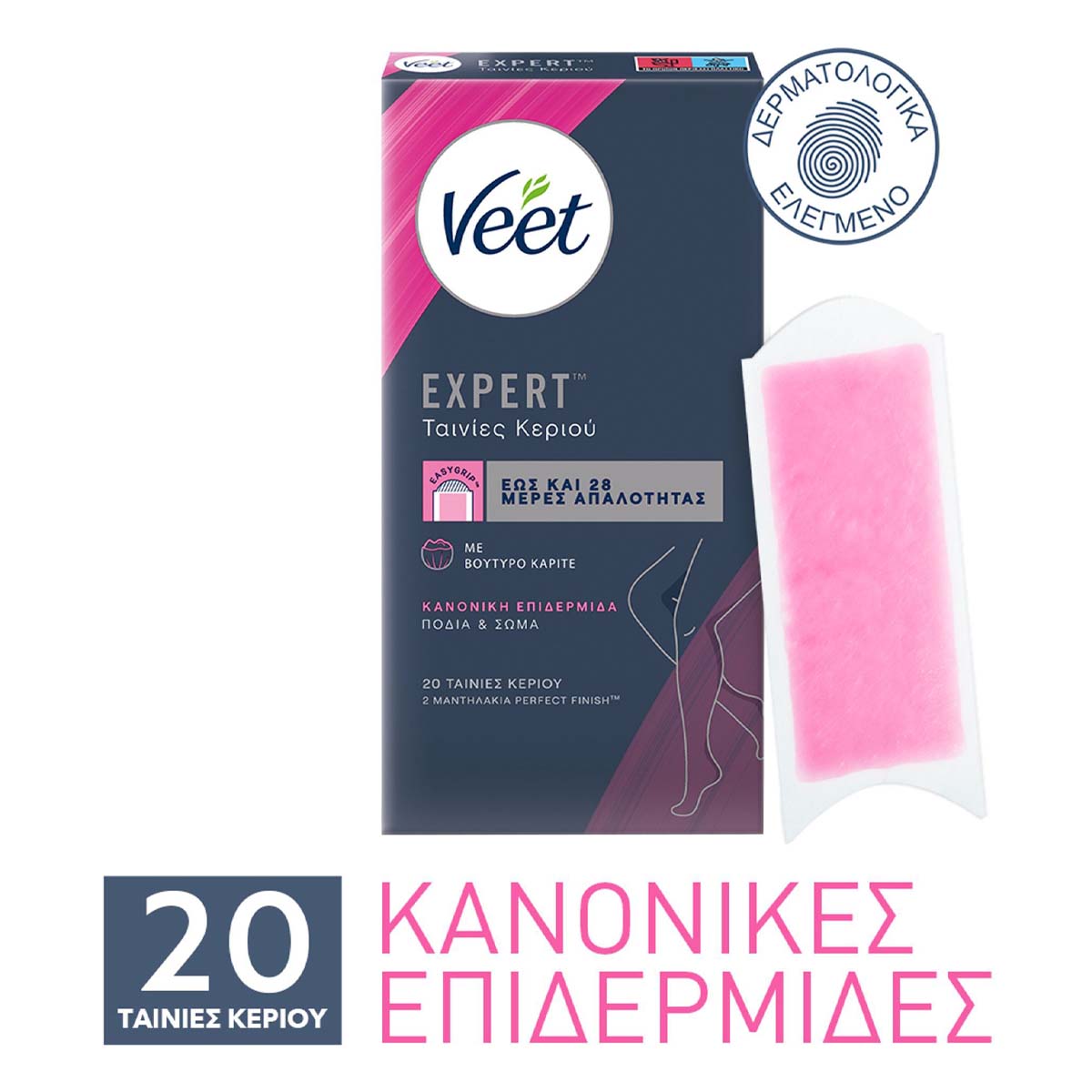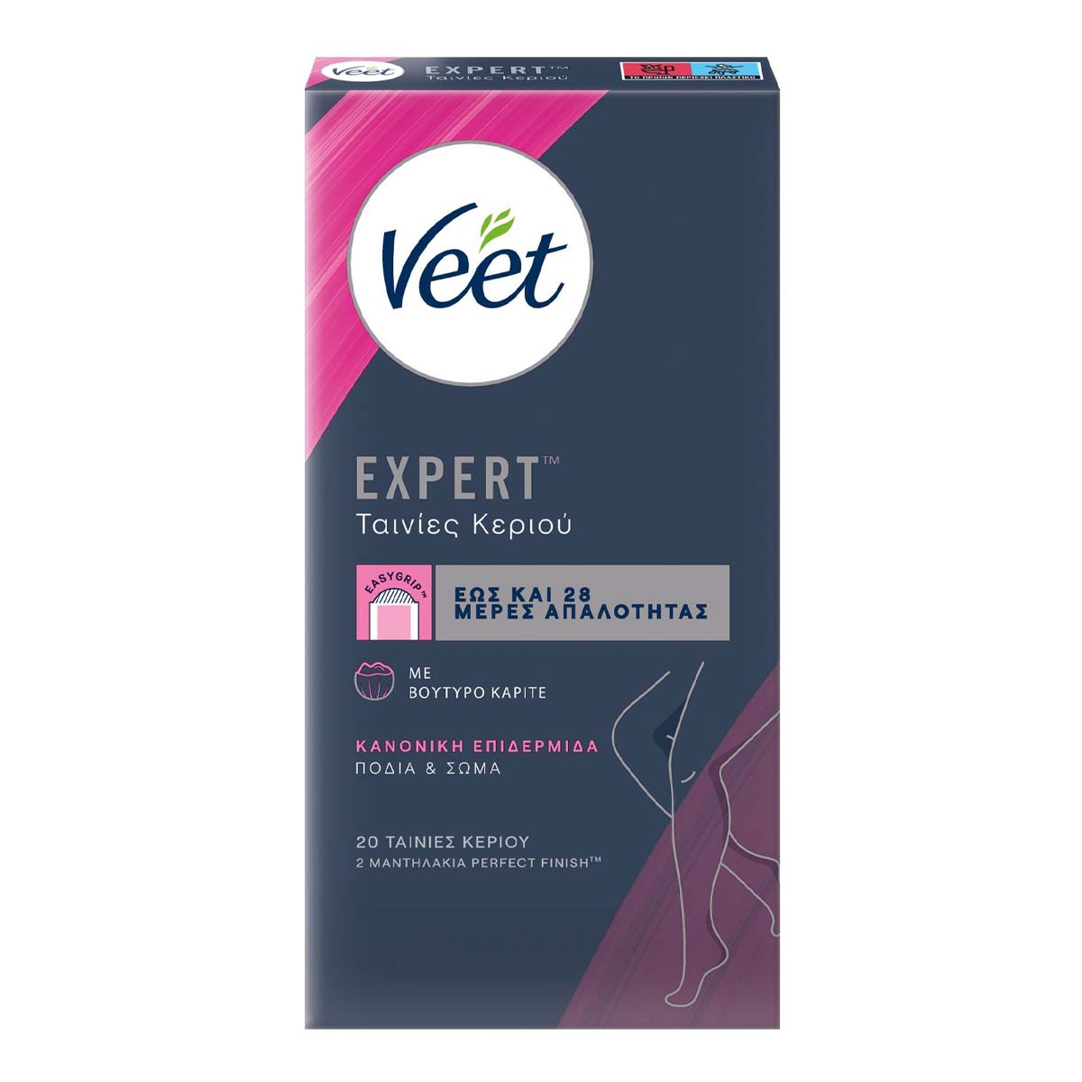 Με τις νέες Veet® Expert Ταινίες Αποτρίχωσης Κρύο Κερί ποδιών μπορείτε να έχετε άμεση επαγγελματική αποτρίχωση και απαλότητα που διαρκεί έως και 28 ημέρες.Έχουν σχεδιαστεί ειδικά με βουτυρο Καριτέ, γνωστό για τις ενυδατικές του ιδιότητες, κατάλληλο για τις ανάγκες του κανονικού δέρματος. Οι αποτριχωτικές ταινίες είναι εύκολες στη χρήση - Οι ειδικά σχεδιασμένες EasyGrip™ σας βοηθούν να πετύχετε την καλύτερη τεχνική αποτρίχωσης για τέλεια αποτελέσματα με μία εύκολη κίνηση. Οι Ταινίες Veet® Expert είναι έτοιμες για χρήση και σας βοηθούν ώστε να αφαιρεθούν ακόμα και οι πιο κοντές τρίχες*.Αφαιρούν τις τρίχες από τη ρίζα, για απαλότητα μέχρι και 28 μέρες. Έτσι σου δίνουν τη σιγουριά να πετύχεις εξαιρετικά αποτελέσματα από την 1η φορά, ακόμα και αν δεν έχεις εμπειρία με τις ταινίες κεριού.