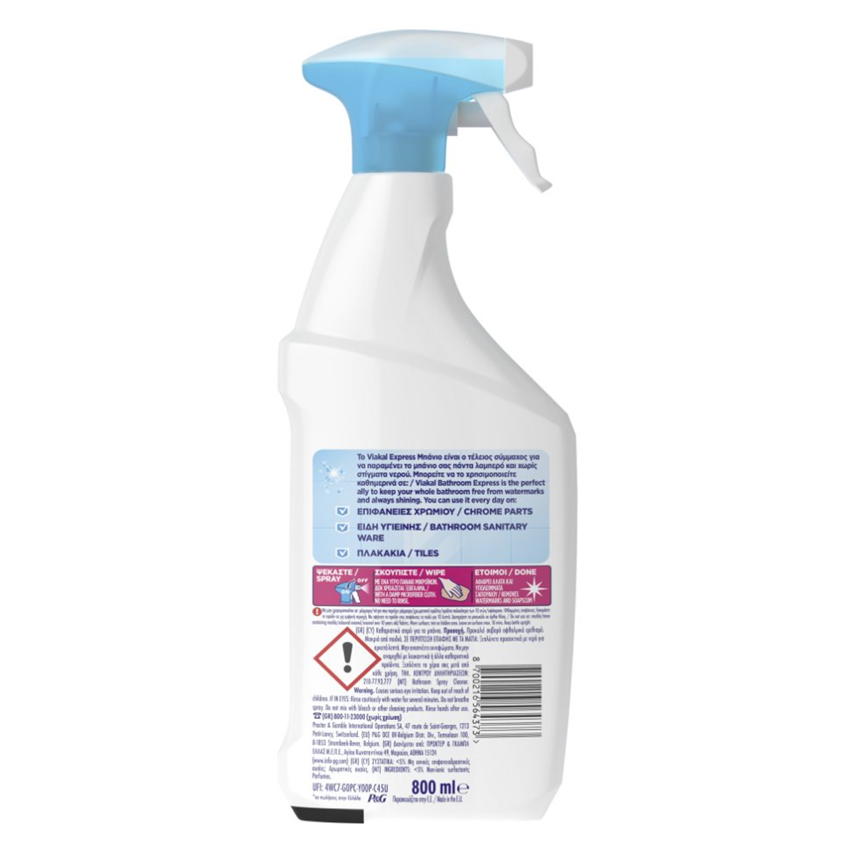 Το Viakal Μπάνιο Express Φρεσκάδα λουλουδιών Spray είναι ο τέλειος σύμμαχος για να διατηρήσετε ολόκληρο το μπάνιο σας πάντα λαμπερό και χωρίς στίγματα νερού. Μπορείτε να το χρησιμοποιείτε καθημερινά σε: Βρύσες, Εξαρτήματα χρωμίου, Τοίχους/Πλακάκια μπάνιου. Το προϊόν είναι ήπιο προς τις επιφάνειες και κατάλληλο για καθημερινή χρήση. Το απολαυστικό άρωμα "Φρεσκάδα λουλουδιών" αφήνει υπέροχη μυρωδιά στο μπάνιο σας, για πολλή ώρα μετά τη χρήση.