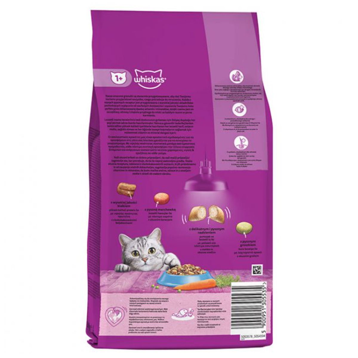 Το WHISKAS® φροντίζει την αληθινή φύση της γάτας σας. Το WHISKAS® 1+ είναι διατροφικά πλήρες και ισορροπημένο, με την ιδανική ισορροπία βιταμινών και μεταλλικών στοιχείων που βοηθά τη γάτα σας να παραμείνει υγιής και χαρούμενη. Τα γεύματά μας προσφέρουν όσα χρειάζεται η γάτα σας από την φύση της. Βοηθά στο καθάρισμα των δοντιών με απαλή, λειαντική δράση. Σχεδιασμό για να βοηθάει στη διατήρηση της υγείας του ουροποιητικού συστήματος. Με Ωμέγα 6 λιπαρά οξέα και ψευδάργυρο που βοηθούν στη υποστήριξη για υγιές δέρμα και τρίχωμα. Με Βιταμίνη Α για δυνατή δράση.