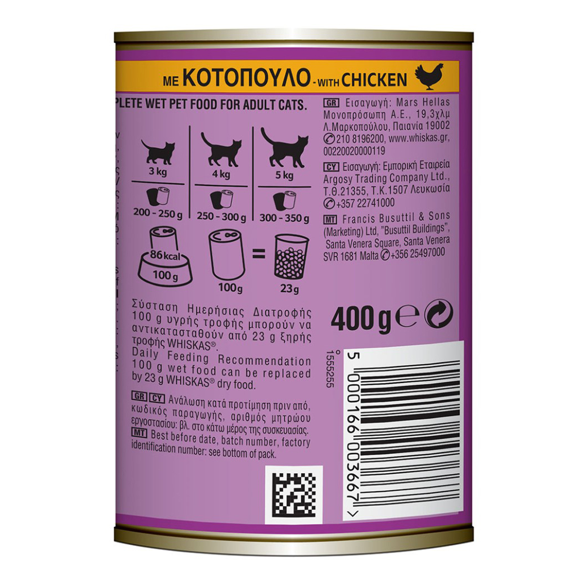 WHISKAS® 1+ Κονσέρβα με Κοτόπουλο Πατέ 400g. WHISKAS® πλήρης τροφή για ενήλικες γάτες. Οι συνταγές του WHISKAS® είναι φτιαγμένες με φρέσκο κρέας και δε χρειάζονται τεχνητά αρώματα. Απλά η φυσική γεύση του κρέατος που η γάτα σας αγαπά.Χωρίς τεχνητά αρώματα ή συντηρητικά. Φτιαγμένο από υψηλής ποιότητας συστατικά. Ιδανική ισορροπία βιταμινών & μεταλλικών στοιχείων.