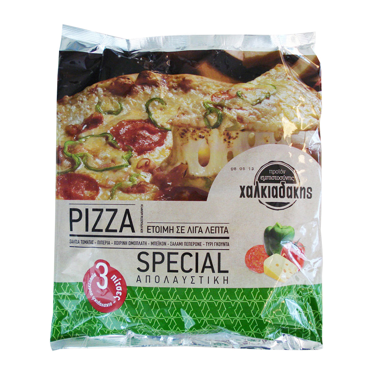 SPECIAL απολαυστική πίτσα με σάλτσα τομάτας, πιπεριά, χοιρινή ωμοπλάτη, μπέικον, σαλάμι πεπερόνε, και τυρί γκούντα. 3 πίτσες σε μία οικονομική συσκευασία. Θέλουν μόνο ψήσιμο.