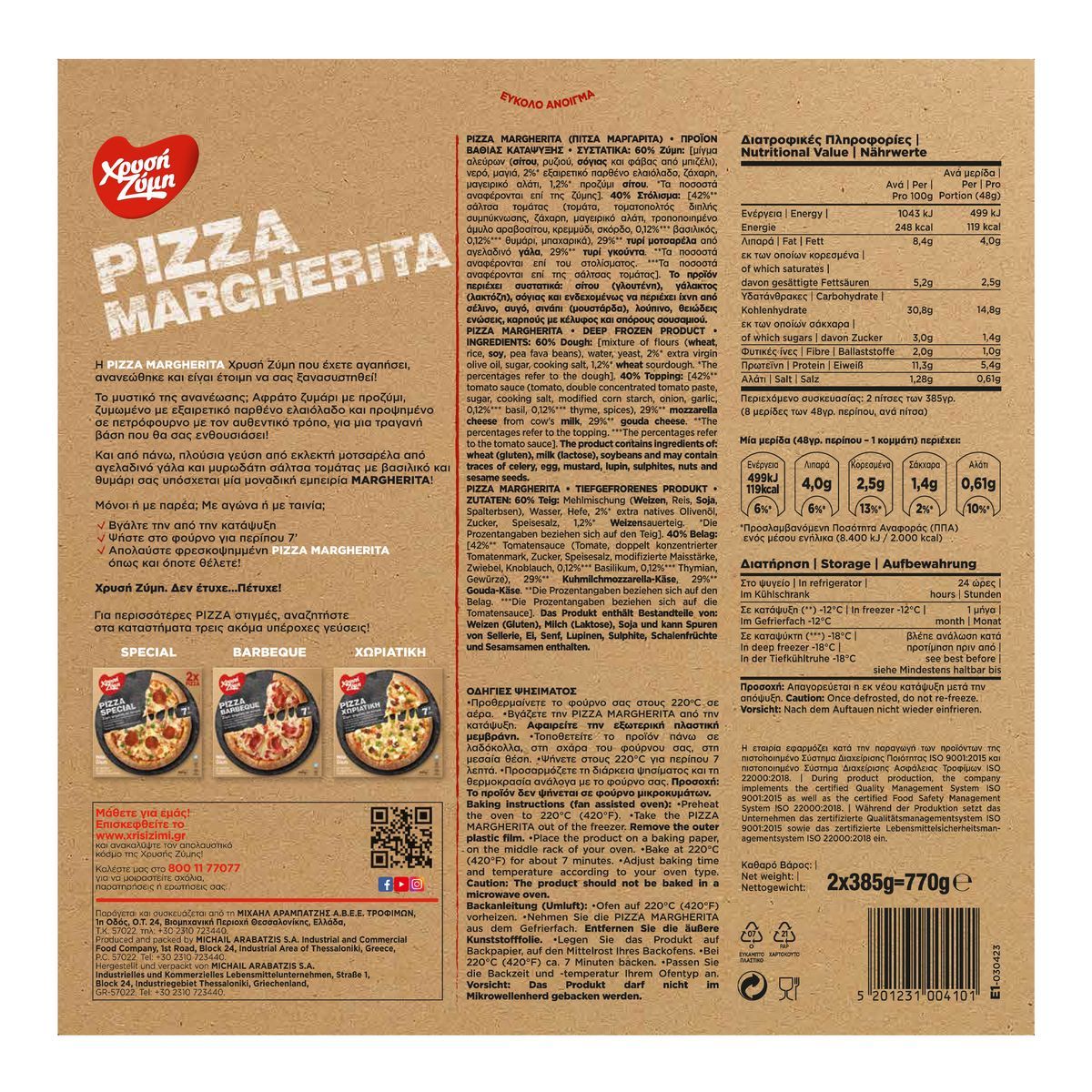Η PIZZA MARGHERITA Χρυσή Ζύμη που έχετε αγαπήσει, ανανεώθηκε και είναι έτοιμη να σας ξανασυστηθεί! Το μυστικό της ανανέωσης; Αφράτο ζυμάρι με προζύμι, ζυμωμένο με εξαιρετικό παρθένο ελαιόλαδο και προψημένο σε πετρόφουρνο με τον αυθεντικό τρόπο, για μια τραγανή βάση που θα σας ενθουσιάσει! Και από πάνω, πλούσια γεύση από εκλεκτή αγελαδινή μοτσαρέλα και μυρωδάτη σάλτσα τομάτας με βασιλικό και θυμάρι σας υπόσχεται μία μοναδική εμπειρία MARGHERITA! Μόνοι ή με παρέα; Με αγώνα ή με ταινία; Βγάλτε την από την κατάψυξη. Ψήστε στον φούρνο για περίπου 7’. Απολαύστε φρεσκοψημένη PIZZA MARGHERITA όπως και όποτε θέλετε! Χρυσή Ζύμη. Δεν έτυχε...Πέτυχε!